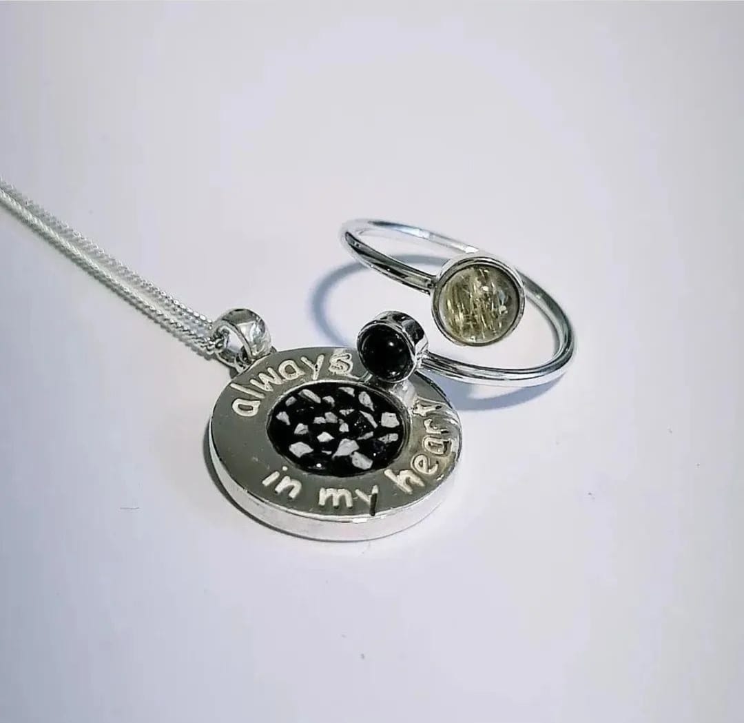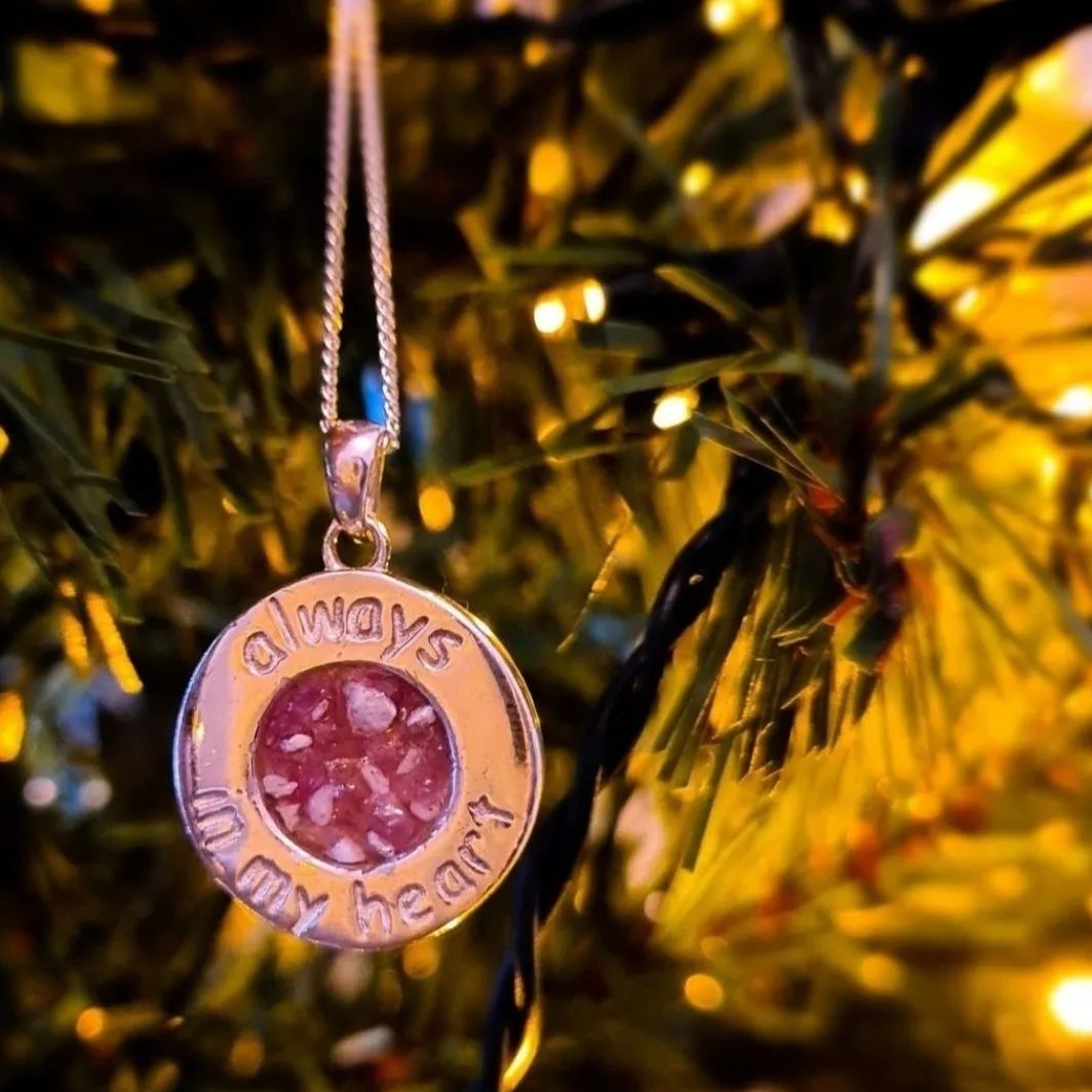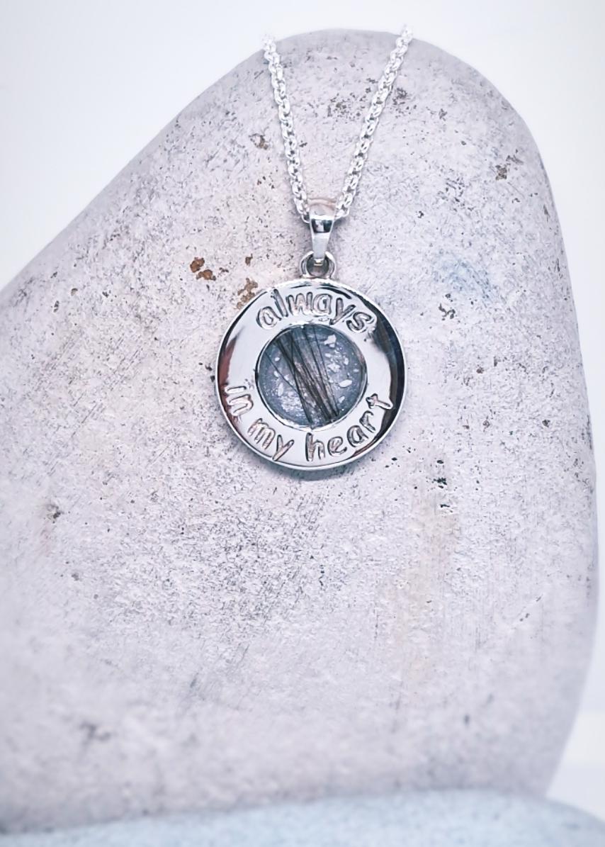 This heavy, Sterling silver pendant with Always In My Heart embossed into the surroundings is a beautiful tribute to be worn every day. Inclusions can be set onto any colour or crushed gemstones.