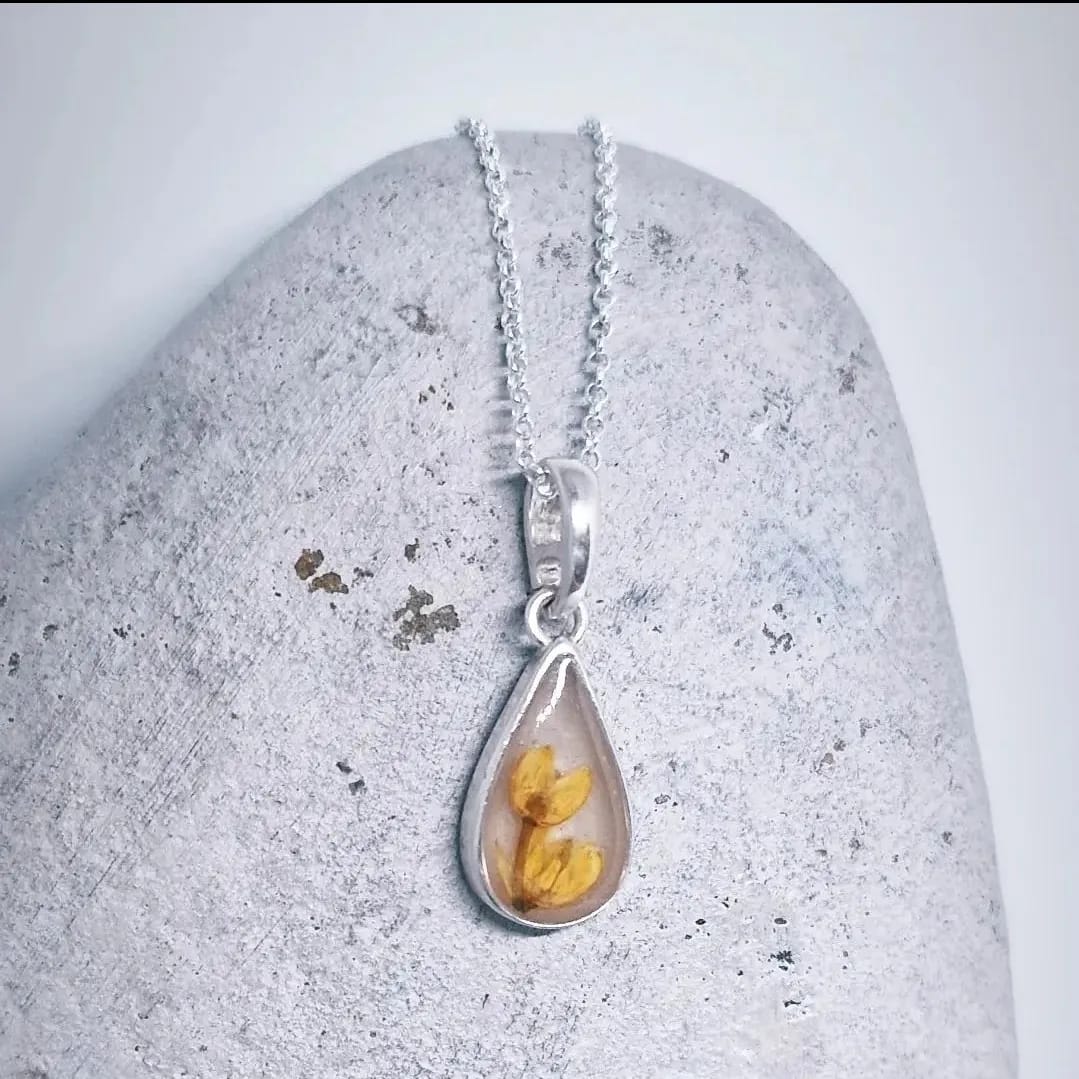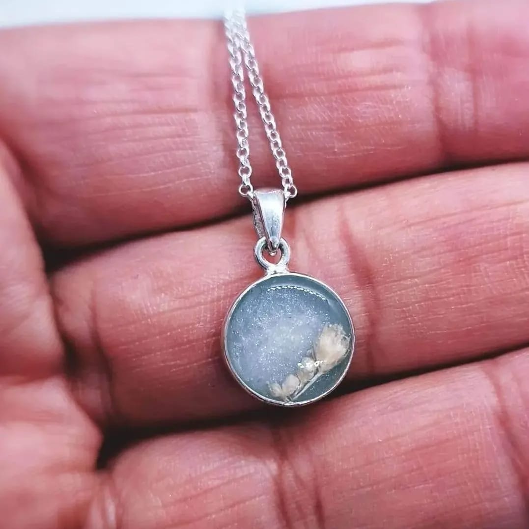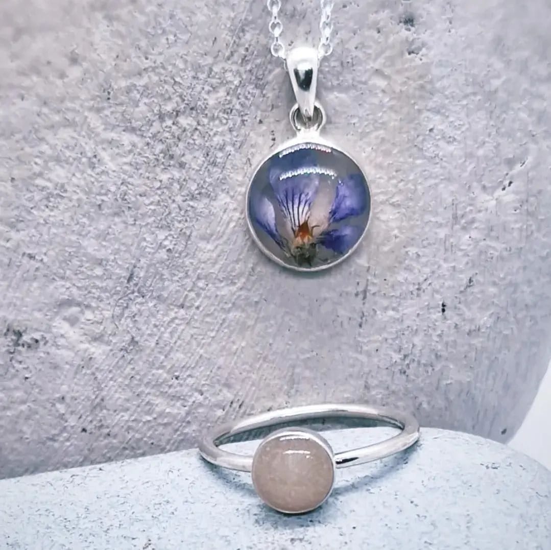 A delicate round pendant, encapsulating one of the most important journeys a mother undertakes. This pendant can be personalised further with birth flowers or with simple white flower buds as the one photographed. The Mama this pendant belongs to wanted a flower bud for each child she has breastfed as she reached the end of the journey with her last baby. The other pendant photo is with a dried Violet, the birth flower for February.
