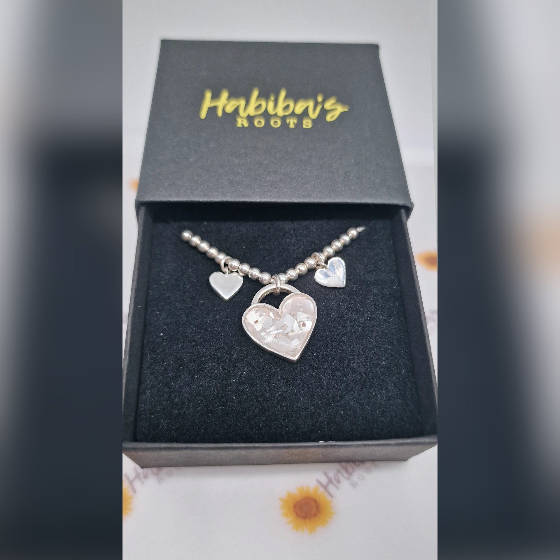 This new addition to Habiba’s Roots is a beautiful and stylish bracelet to commemorate your loved ones. The love is large enough for any design. It is suitable for any colour, crushed gemstone, or floral design.