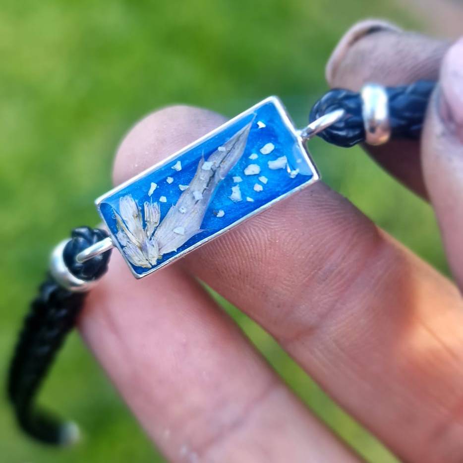 A bracelet for either men or women, this lovely leather-bound bezel is large enough for your inclusions to be set onto a colour base, with crushed gemstones or a floral design.