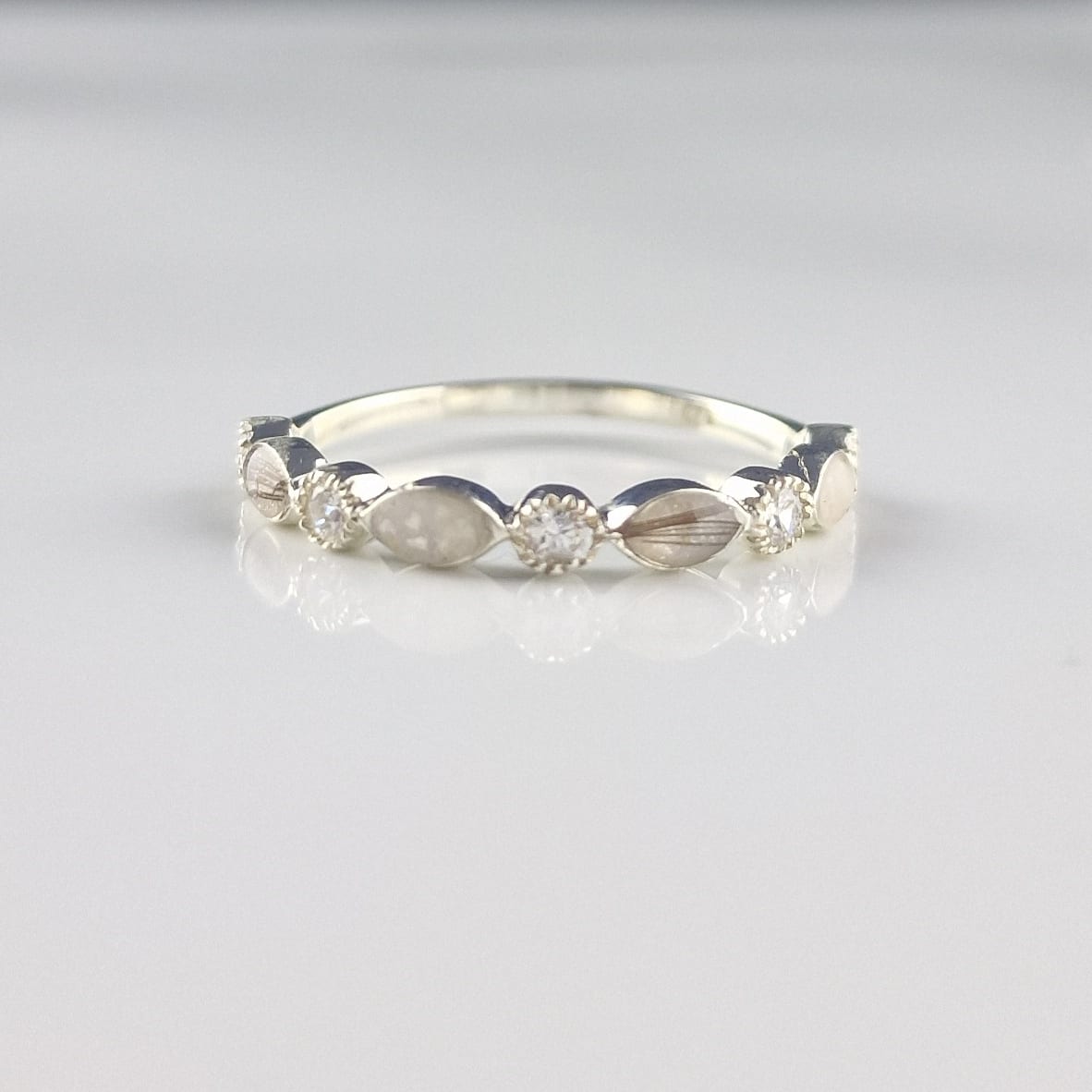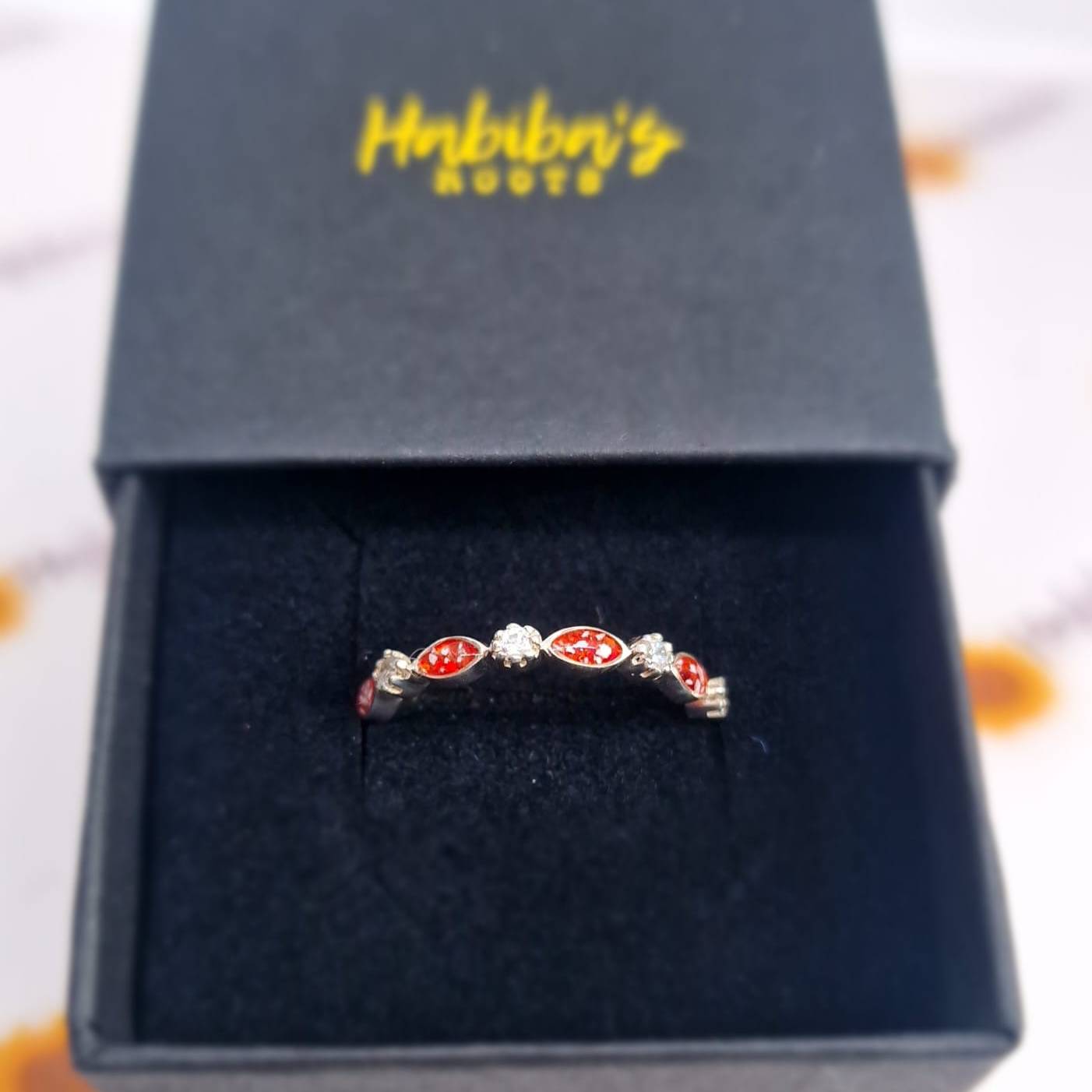The darling Marquise ring is finally here. This delicate band in the classic Marquis design is detailed enough to stand alone on the finger and dainty enough to accompany another band. The space in this ring for inclusions is big enough for your inclusions to be laid on to a colour base or with crushed gemstones.