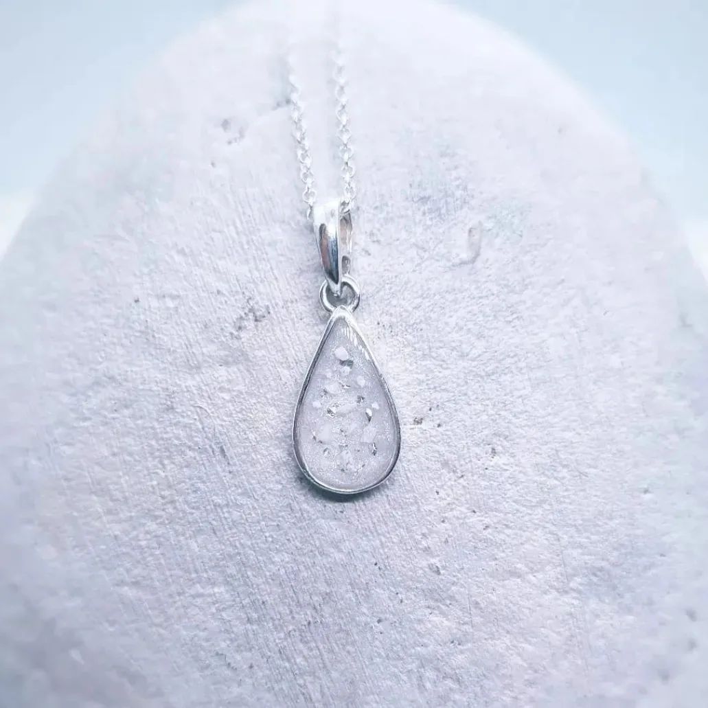 This dainty tear drop pendant is a stunning option to commemorate your loved ones. Inclusions can be set onto any colour base or with flower petals.