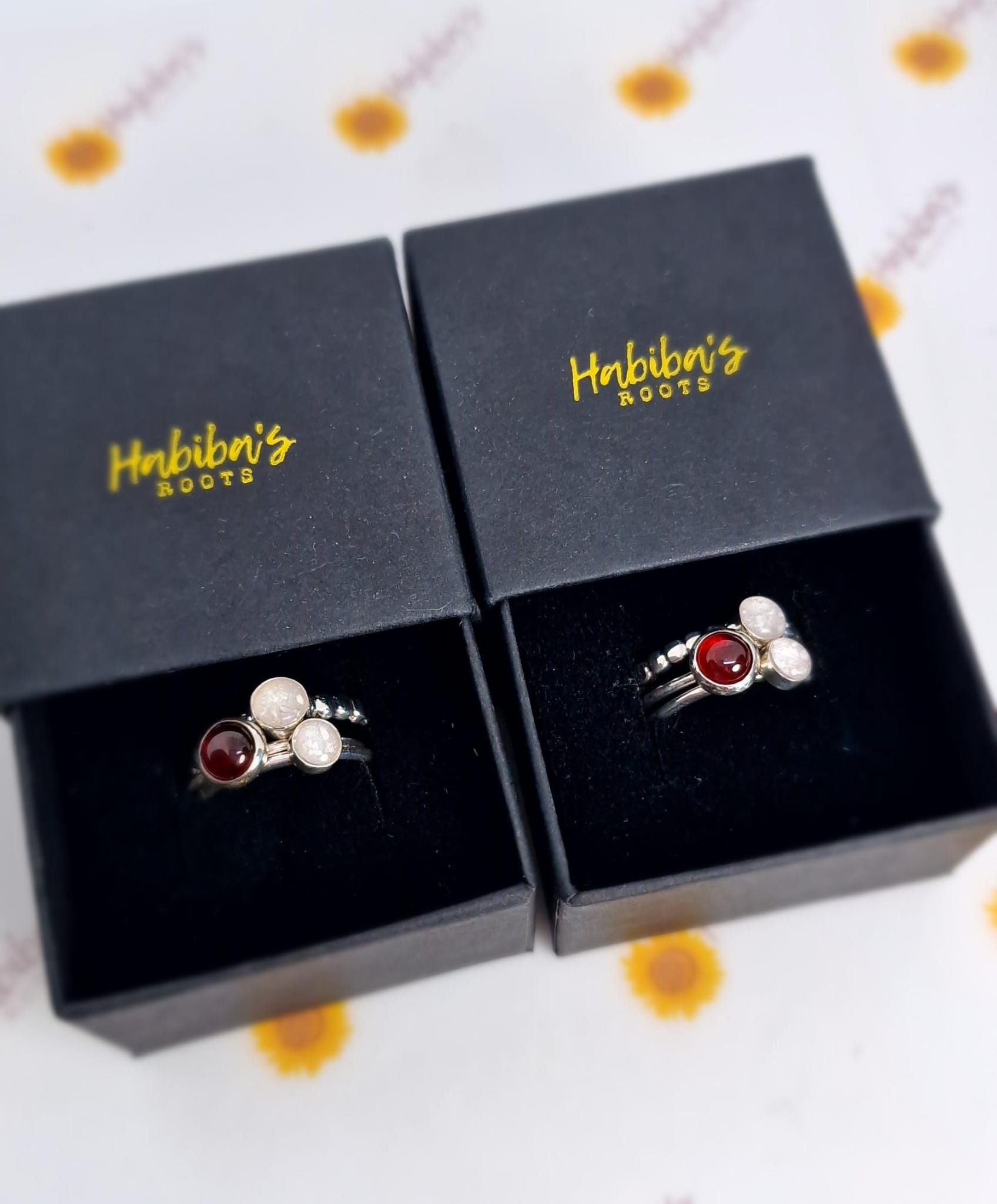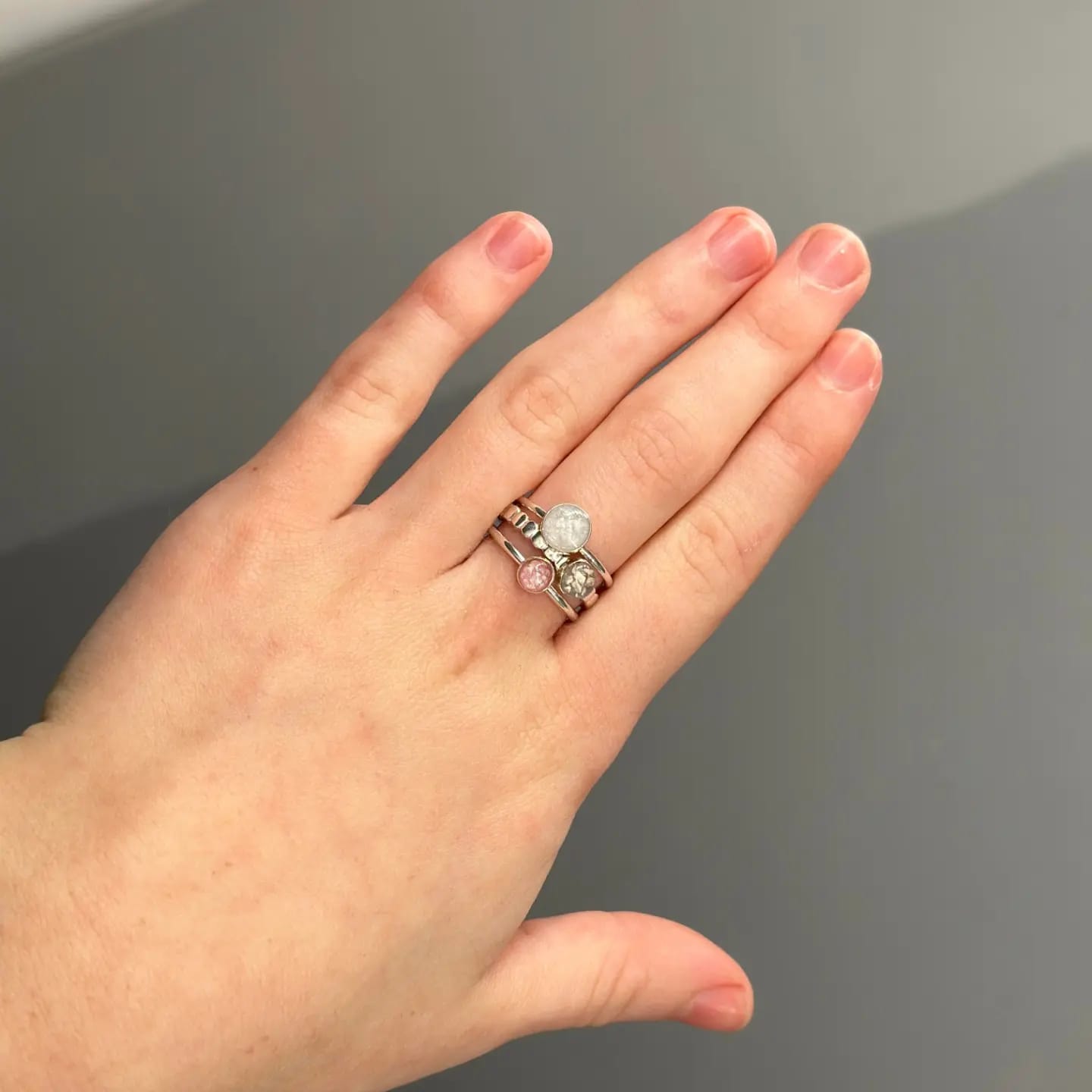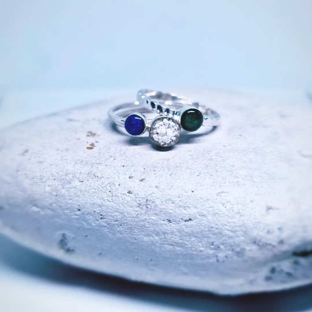 Three rings combine to make this stacking set. There are two plain bands and one bobble band that can be customised to your taste. Lay your loved ones inclusions onto any colour base, with crushed gemstones or flower petals.