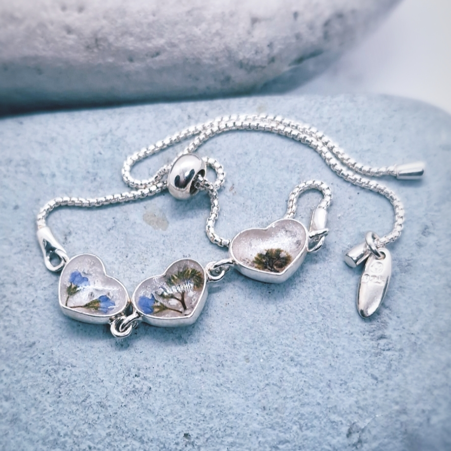 A beautiful rope bracelet with three love heart bezels to hold your inclusions. This bracelet is suitable for a colour base, crushed gemstones or flower petals.