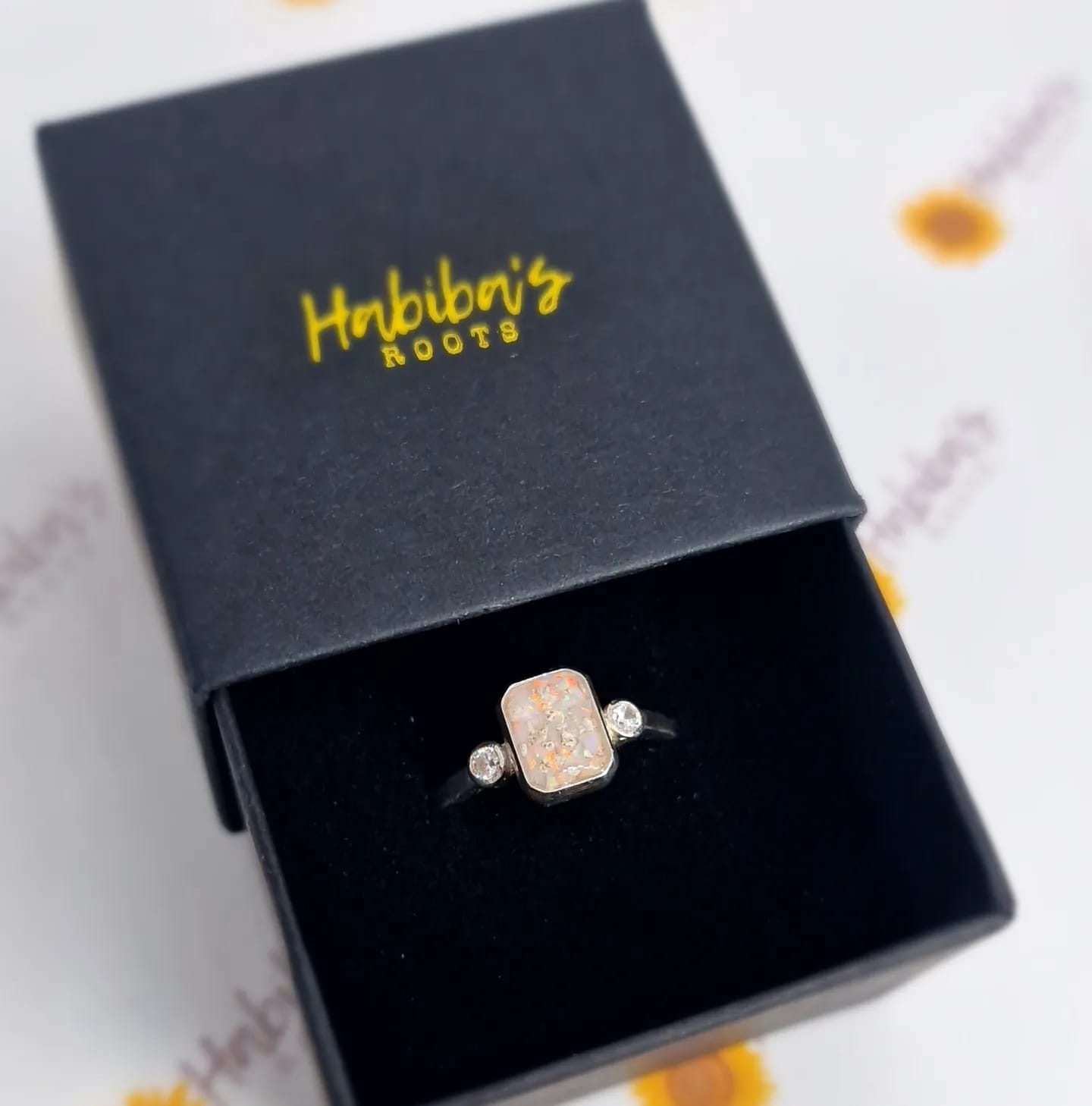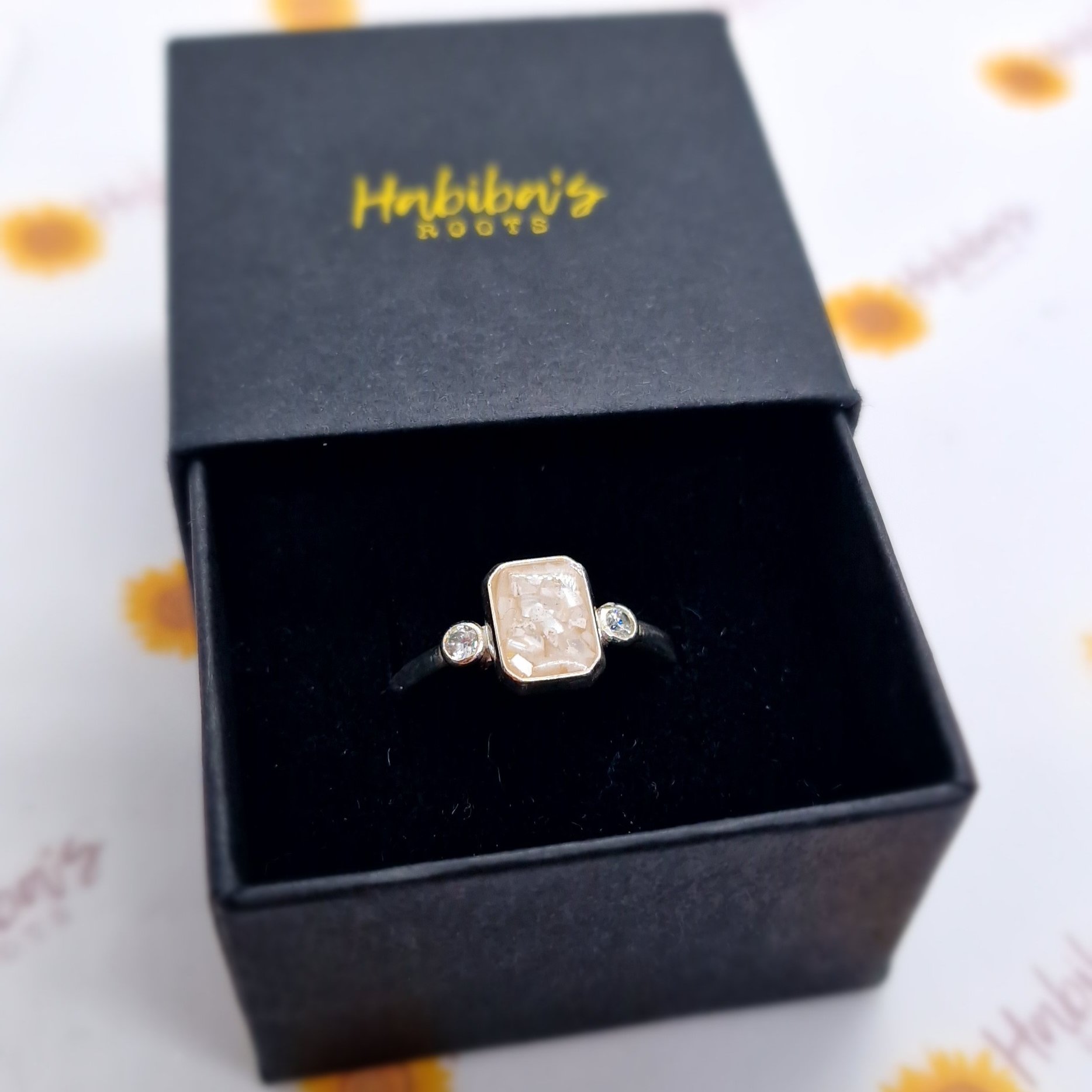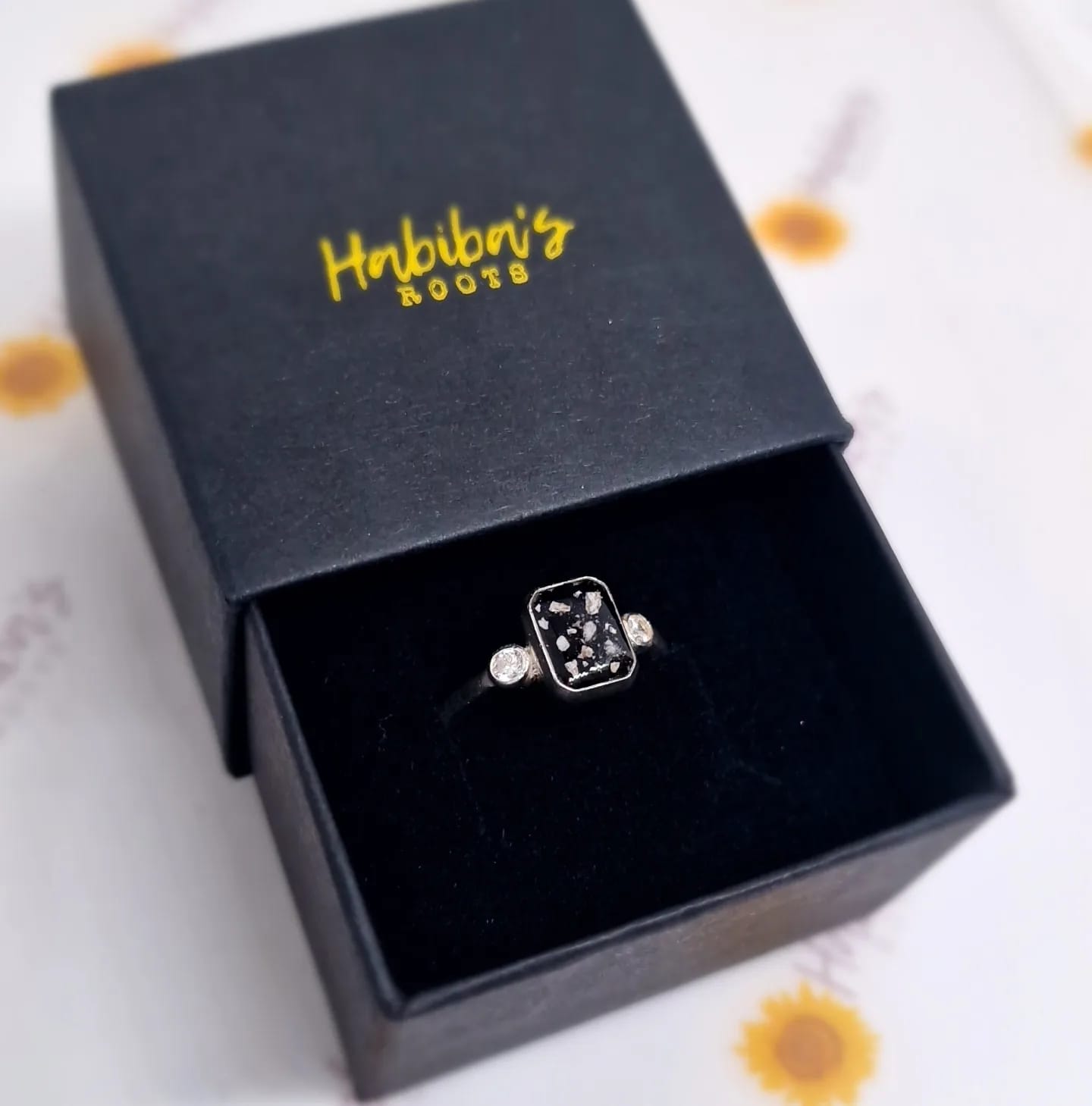 With an emerald-shaped bezel to hold your beloved inclusions, this ring is named Venus after the Roman, Goddess of love. It was believed that wearing Emeralds brought hope and love into your life. I hope that this beautiful ring helps you to feel closer to the ones you have lost or are paying homage to.